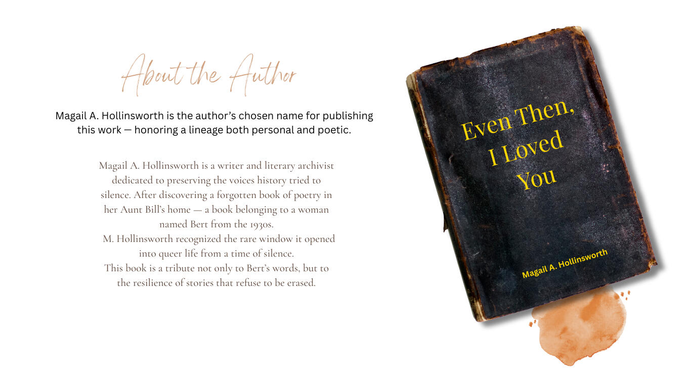 Even Then, I Loved You is a poetry collection first written and collected nearly a century ago. It belonged to a woman named Alberta Desiree Berton, affectionately known as “Bert”— a deeply reflective, poetic voice whose life left few public records but whose writing endured.